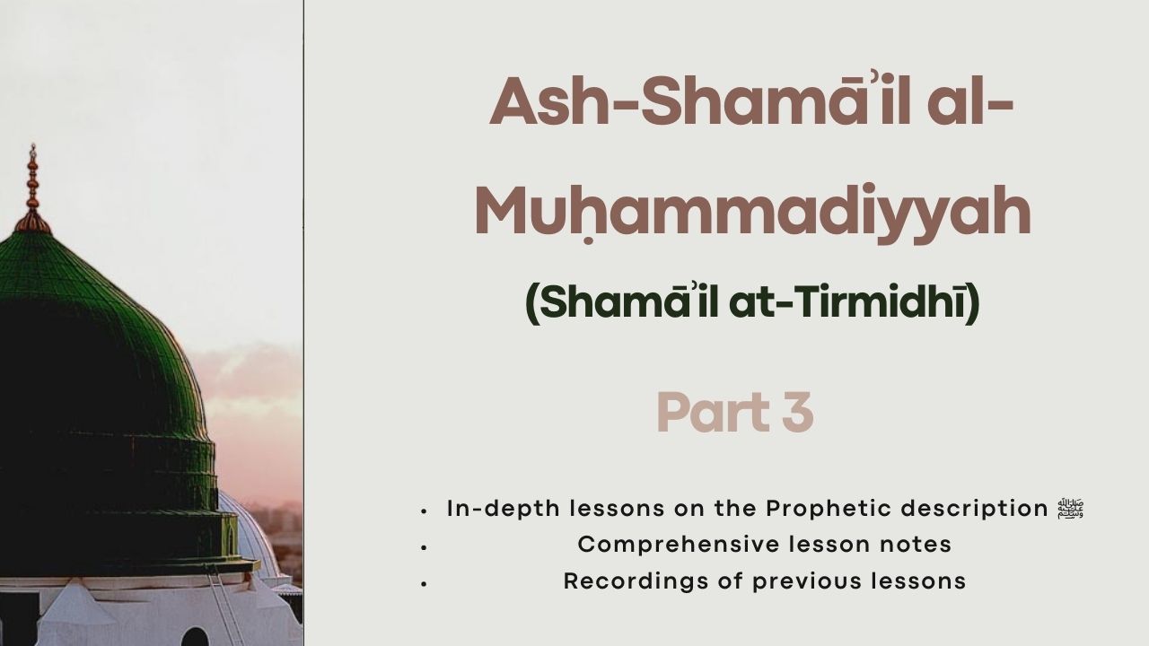 This third instalment of the Shamāʾil at-Tirmidhi series offers an immersive and detailed exploration of the blessed physical characteristics of the Prophet ﷺ. Building upon the knowledge from Parts 1 and 2, this course provides students with a deep study into comprehensive and authentic descriptions of the Prophet’s ﷺ noble appearance.